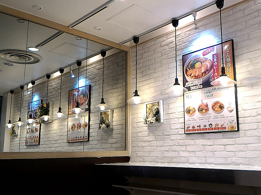 店舗の入り口、外から見えるカウンターの上部にあるメニューは、弊社の「LEDパネル ラクライト(フレームはワイド30を使用)」を5連結させたLED連結メニューボードです。各フレームの連結や天吊り構造は、「グリップフレームシステム」を使って組み立ててあります。
