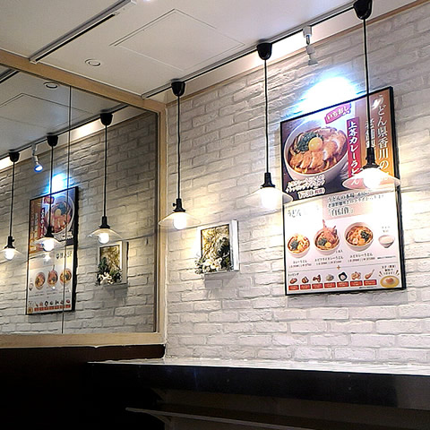 店内の壁面は、清潔感のあるイメージで、オブジェとメニューポスターが展示されています。使用しているポスターフレームは、ソフケンフレームの定番「ラクパネ」の黒色です。「ラクパネ」は、前開き式のポスターフレームですので、壁面に取り付けた状態でも、ポスターの入れ替えを行うことができます。